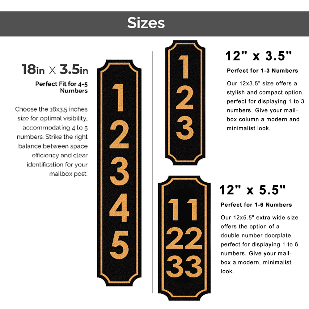 Signs are 3.5"/5.5" wide and 12"/18" tall, depending on the length of your address. The one-digit option is (3.5*12/18) inches, and the two-digit option is (5.5*12/18) inches.